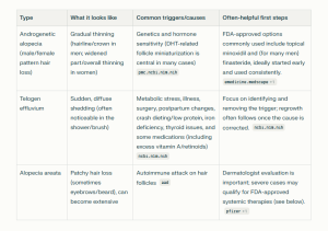 A 2025 guide to hair loss treatment: learn the main types of hair loss, how dermatologists diagnose it, and proven treatments—from minoxidil/finasteride to FDA-approved JAK inhibitors for alopecia areata.